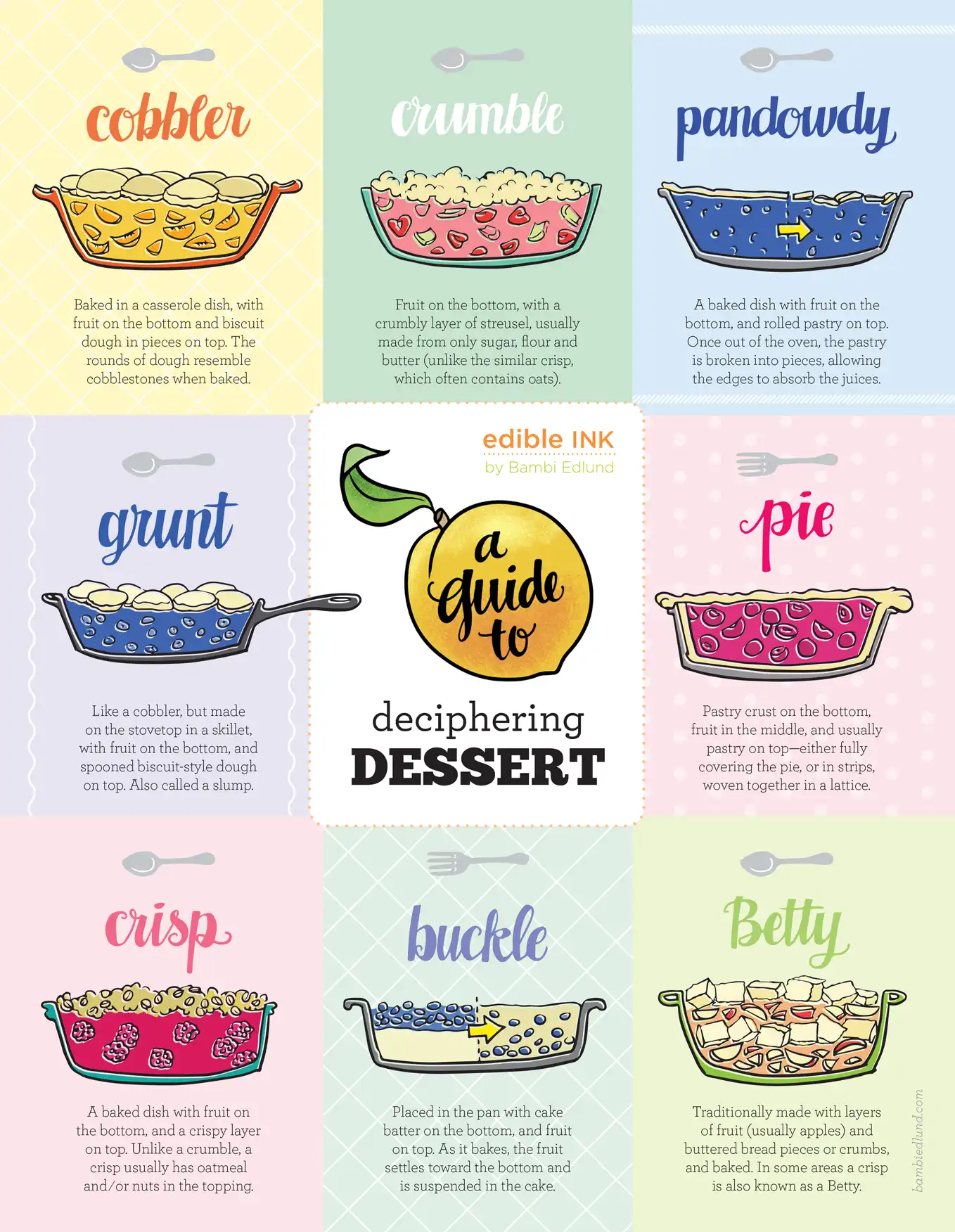 What is the difference between a crumble and crisp, a grunt and a cobbler? This infographic explores the proper terms for some of your favorite slab and traditional pie desserts.