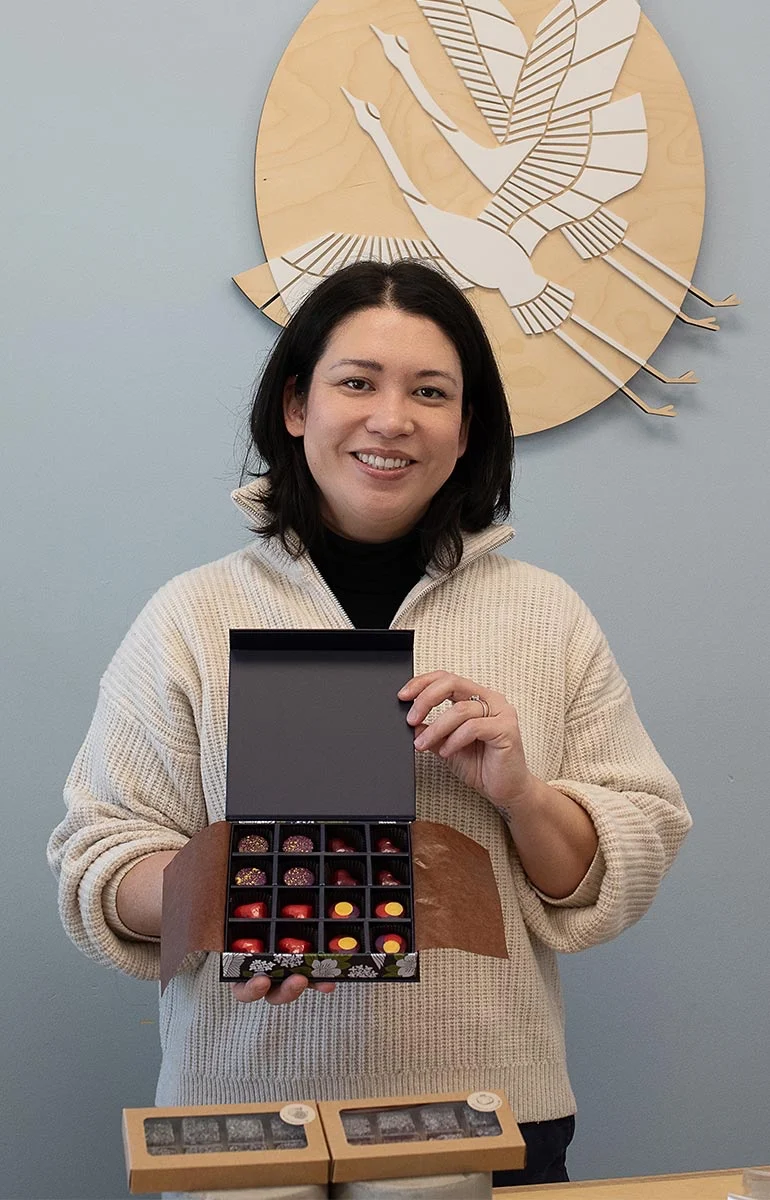 Getting chocolate to consumers is a long journey from bean to final product. Says Michiko Marron-Kibbey, founder and chocolatier at Deux Cranes, “From day one [it takes a lot] to create this magical product that everybody loves. It doesn’t just show up at your doorstep. We’re such a late part of the chain, when I get to add my flavors and make it pretty. I have so much respect for bean-to-bar makers. My passion is much more in the flavor area, post chocolate production. How much love and work goes into it before it even gets to me. It can be often overlooked and easy to forget when looking at a ▉▉▉▉▉▉▉ bar.”