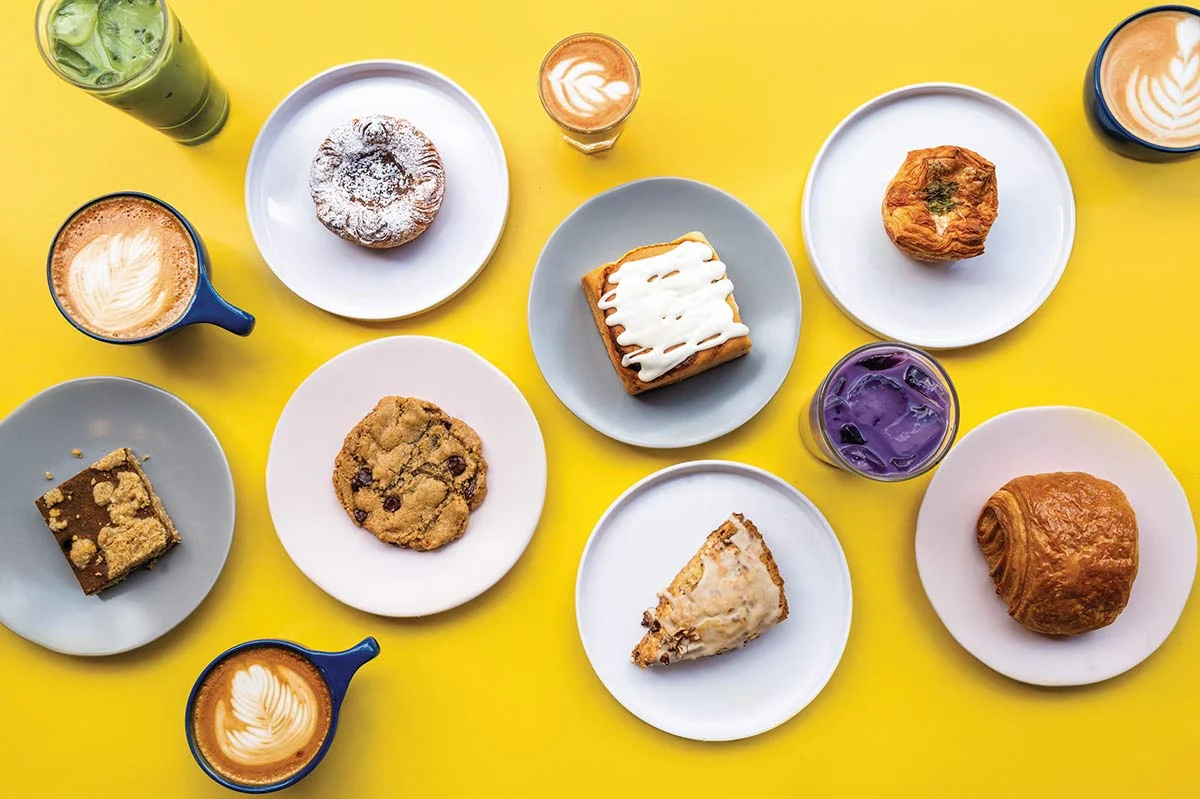 Voyager’s menu offers a taste of home for some and new flavor experiences for others. “All of our destination drinks are based on places we’ve traveled to and the flavors we’ve seen from different cultures,” says Lauren. Ube yam gives the coconut crème–sweetened Manila latte its purple hue. The Lexington, a take on caramel macchiato, incorporates a house-made Jim Beam Kentucky Bourbon Whiskey reduction. And The Tokyo infuses fl oral cherry blossom water, house-made vanilla syrup and brown sugar in latte form.