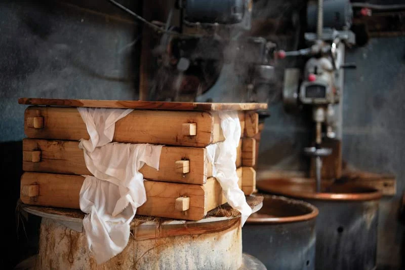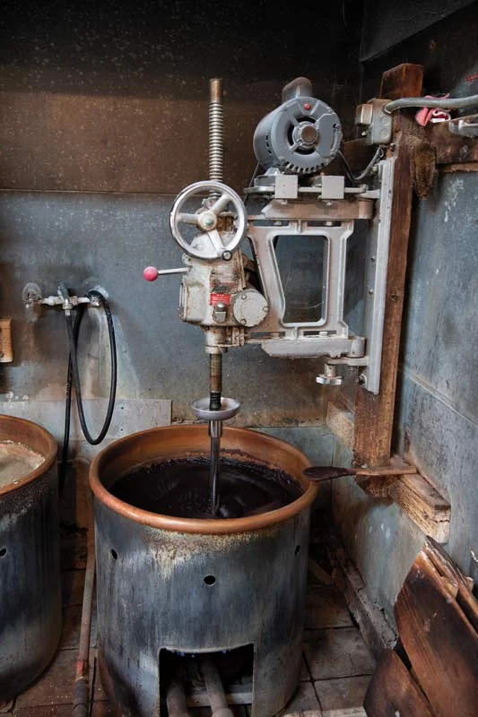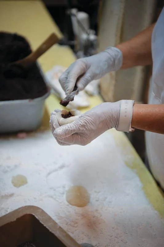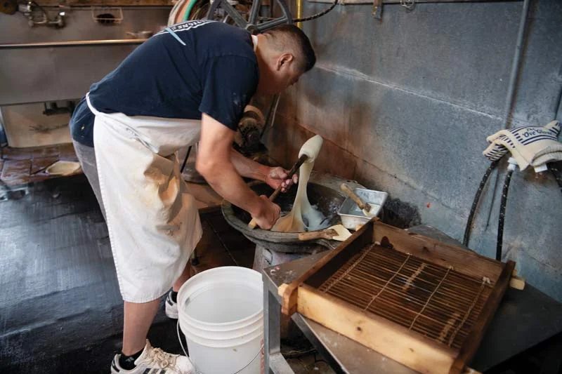At 4am Tom Kumamaru gets up before sunrise and heads to the back kitchen. He must rinse, boil, simmer, peel and mash the beans for the day’s anko; 40 pounds of thick and smooth red bean filling and 25 pounds of a chunkier, whole-bean filling. Three round metal stoves sit close to the ground from where a flame is lit underneath; scorched and timeworn wooden lids sit on top to trap in the steam. The beans boil for four hours before they are rinsed, only to be placed back on the stove to simmer and thicken for another three hours. The Kumamarus’ son helps carry and rinse the beans, a heavy but essential step to get rid of excess starch and bitterness. After water and sugar are added, the mixture gets separated into deep metal pans where they are prepped into the two anko fillings. They all know by look and feel when the beans are done, never using a timer. The kitchen is already hot as they begin to prepare the dough. The process is laborious as the heavy dough must be held and worked with by hand while it’s pliable and still piping hot.