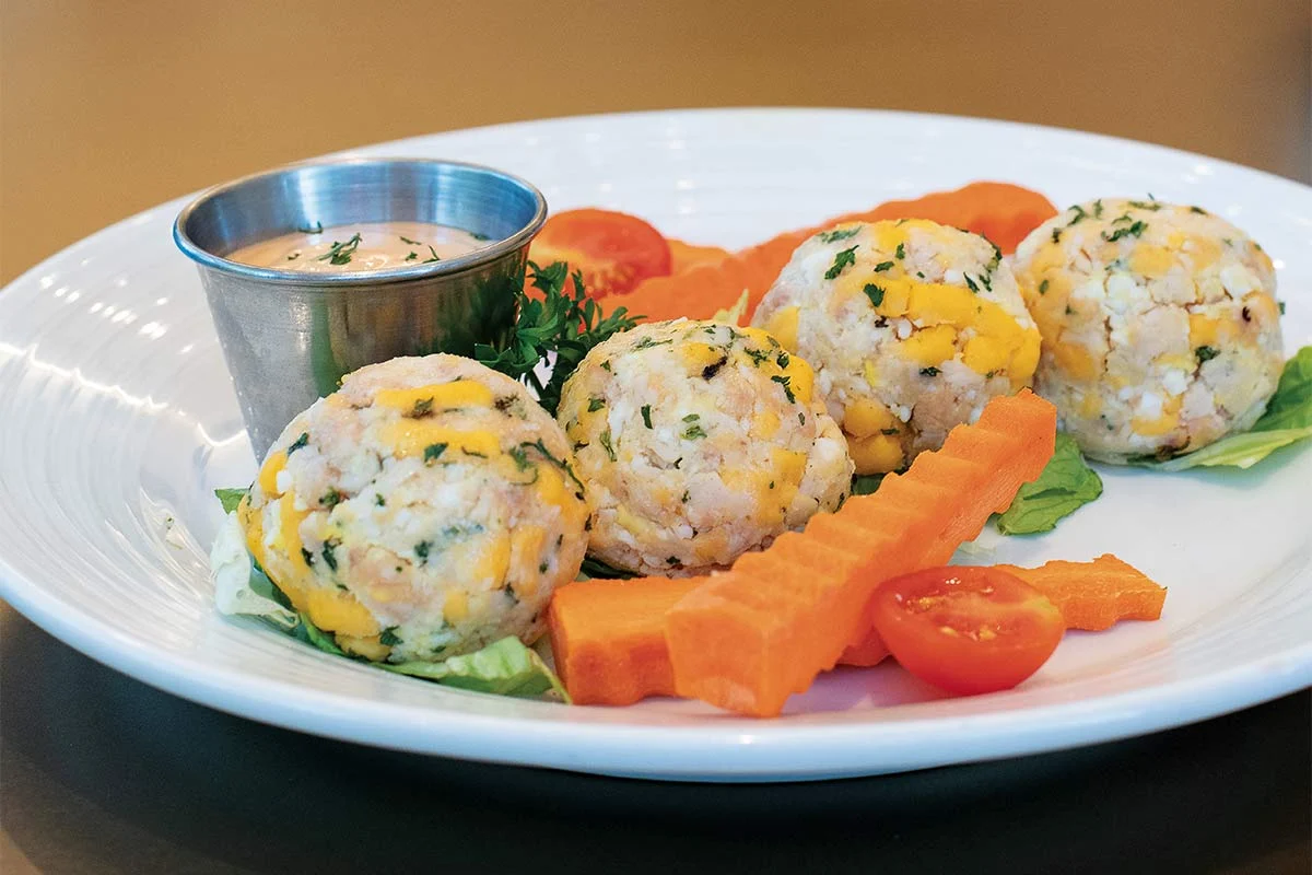 Another very popular example is the “Chef Salad.” The cooked protein ingredients found in this typical entree salad are ground up and made into cute, golf-ball-sized rounds, then placed on a bed of lettuce and served with a dipping sauce. This version of the classic is easier to pick up and eat, without losing the nutritional value of all those proteins and veggies.